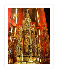 而到了十四世纪,西班牙国王派遣的两位探险家哥伦布和麦哲伦,他们的发现不但改变了世界版图,也改变了西班牙。到十六世纪末,西班牙成为世界的黄金之国,黄金塔、黄金船队、黄金世纪都成为西班牙留给历史的永恒名词。而用黄金进行的艺术创作也达到顶峰,TOLEDO大教堂,这个有着近800年历史,并与巴黎圣母院齐名的圣地,更是以其镶满黄金的圣体闸(MONSTRACE OF ARFE)而闻名于世;同处一城的ANFRAMA,苛守神圣的信仰和诚信的精神,以艺术创作中色泽和线条变化的需求为唯一标准,只采用纯正的18K金和24K金来制作产品。